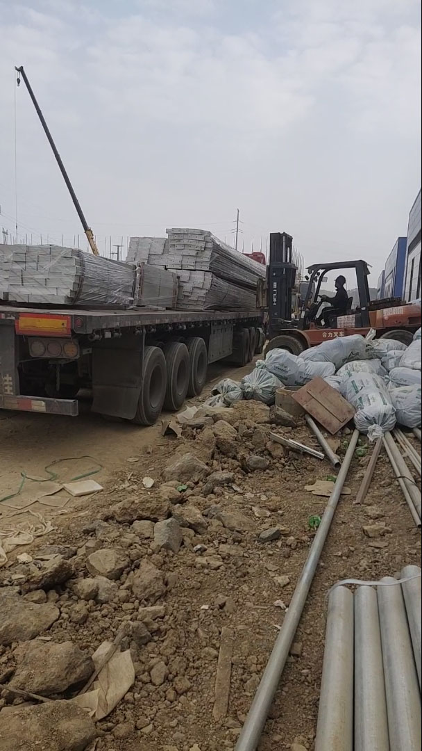 貨架剛剛到廣西南寧目的地,叉車正在卸貨,因為貨架的立柱比較長,需要兩臺叉車一起齊心協力把它叉回倉庫。